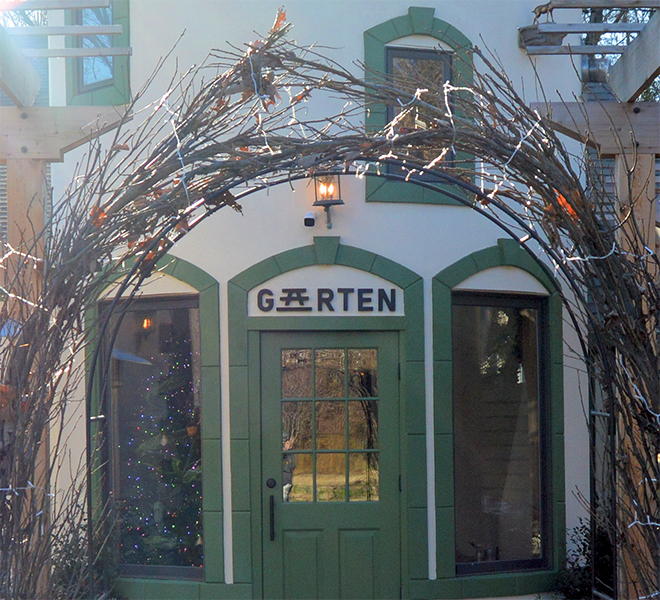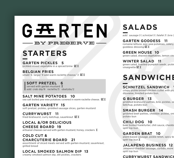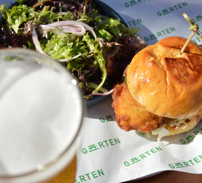 Garten is a modern take on the German beer garden. The simple picnic table found in many beer gardens is not only a symbol of the establishment but also of bringing people together around good food for the shared purpose of enjoying themselves and each other.
